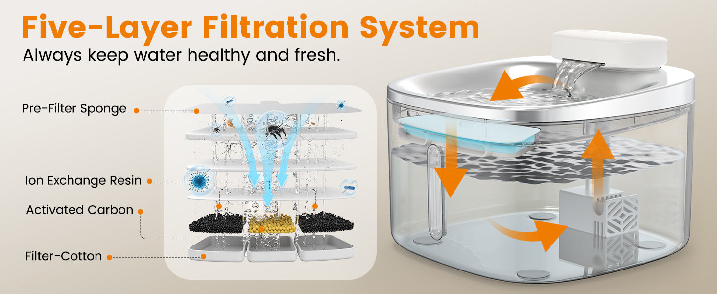 Filters help remove impurities, hair, food particles, and other debris from the water, keeping it clean and safe for your pet. Many filters also have activated charcoal to help reduce odor and improve the taste of the water, which can encourage your pet to drink more.
