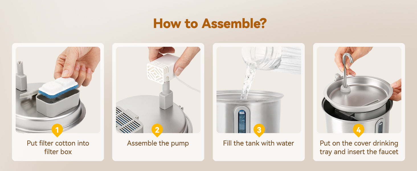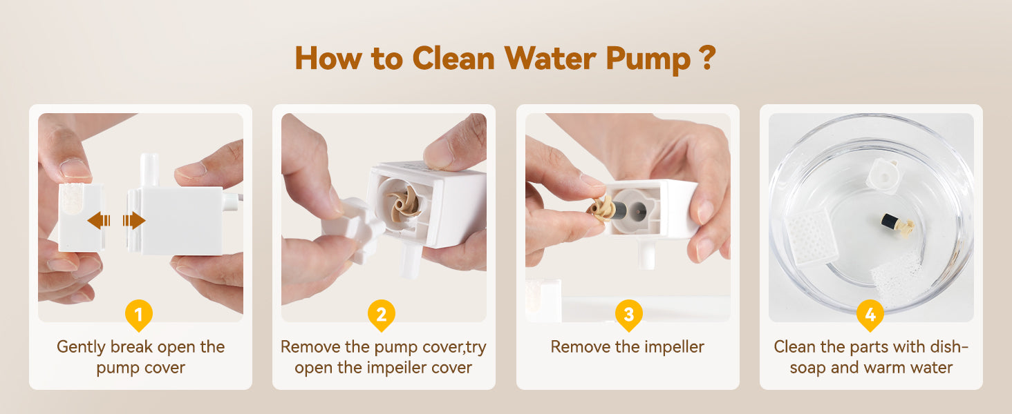 The water pump and dispenser need to be cleaned every 1–2 weeks, every2-4 weeks you need to change the cartridge, we will provide you with 2 extra sets offillters