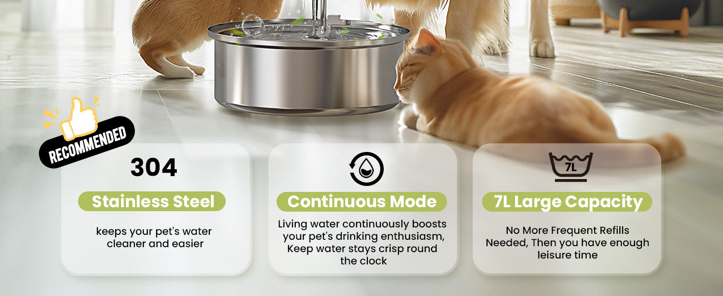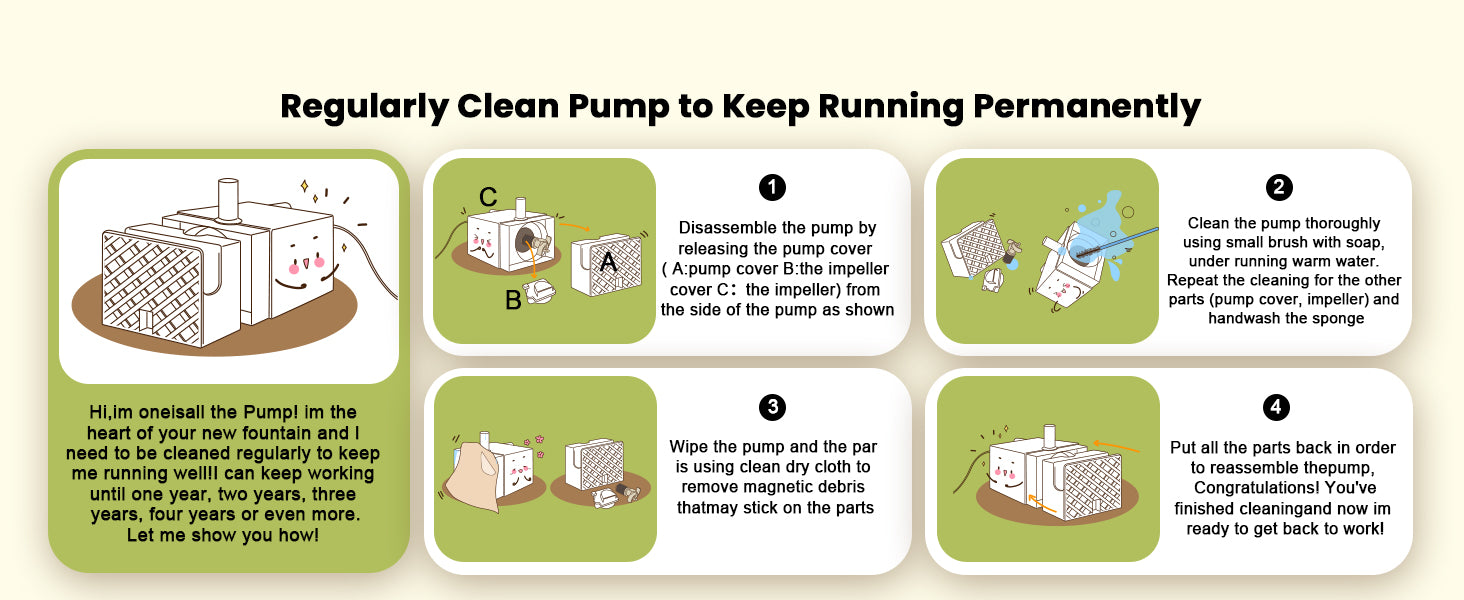 The water pump and dispenser need to be cleaned every 1–2 weeks, every2-4 weeks you need to change the cartridge, we will provide you with 2 extra sets offillters