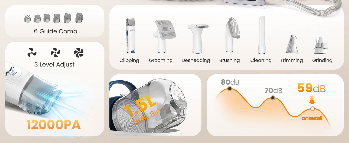 The noise of our pet grooming kits is less than 60db, it is a relatively soft sound level, similar to a calm office environment, or a low-volume televisionwhich which not scare pets.