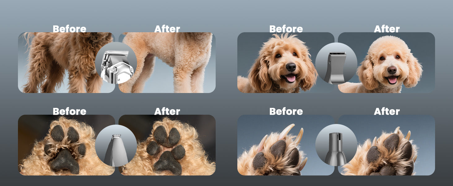 Dog clippers are designed for full-body grooming and can handle large sections of fur, while dog hair trimmers are typically used for detailed work around sensitive or small areas like the paws, face, and tail.